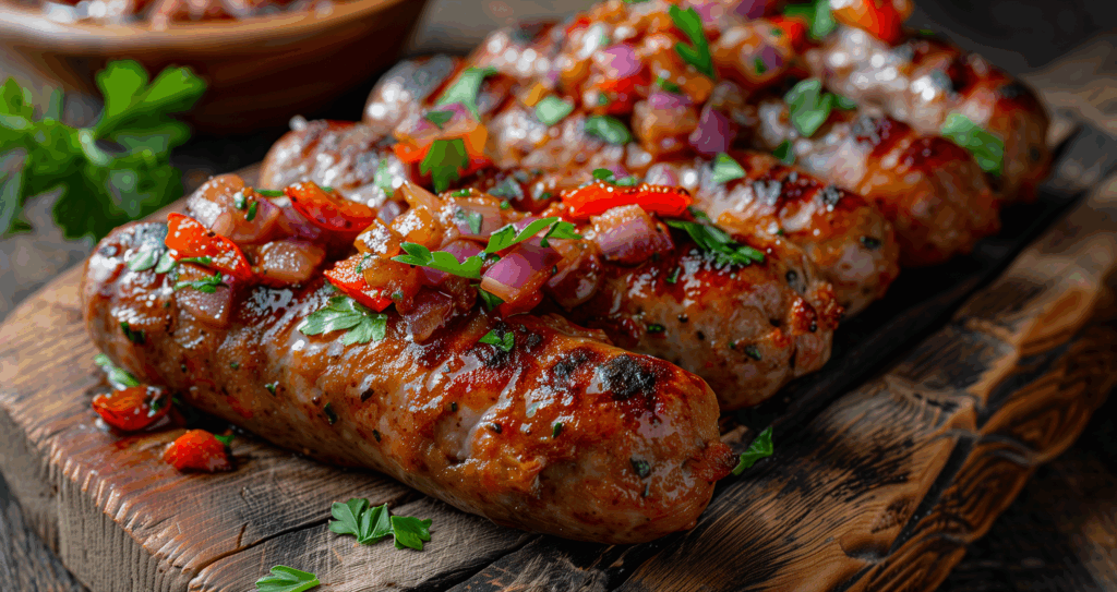 - Cevapcici: Hackfleisch mit fein gewürfelter Zwiebel, gepresstem Knoblauch, Paprikapulver, Senf, Majoran, Kreuzkümmel, Salz, Pfeffer und Mineralwasser vermengen. Mit angefeuchteten Händen zu kleinen Röllchen formen, optional 15–20 Minuten kalt stellen.